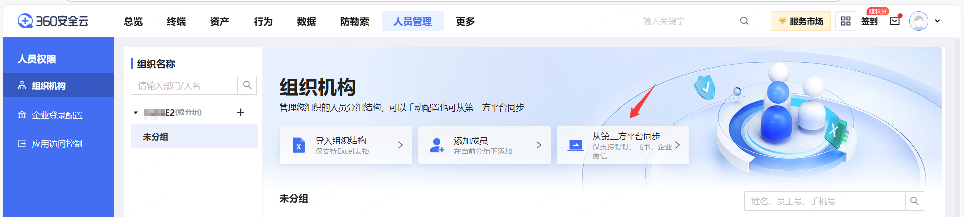 登录 360 安全云平台,在顶部导航栏中依次点击【人员管理】-【组织机构】。