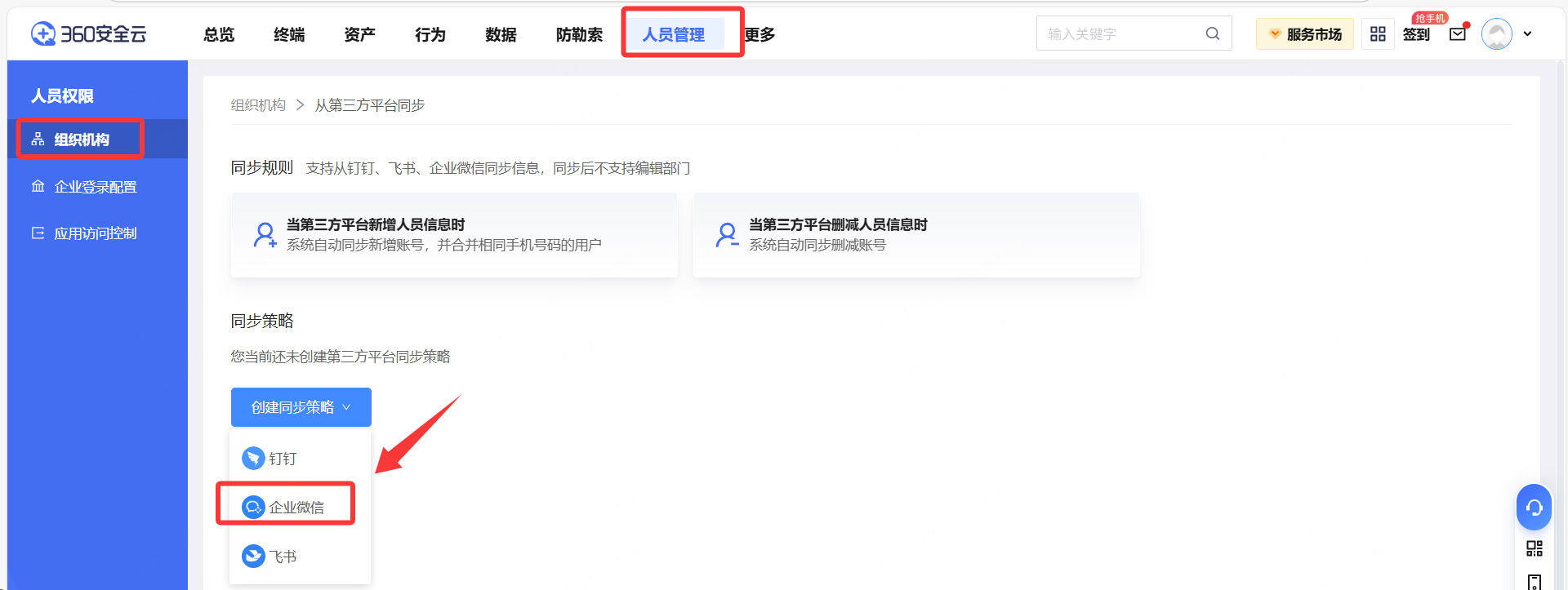 本文档旨在为用户提供 360 安全云中企业微信同步任务创建与企业微信登录配置的详细操作指南,帮助用户轻松完成相关设置,实现企业微信与 360 安全云的高效协同,方便企业对人员进行统一管理,提升工作效率与数据安全性。