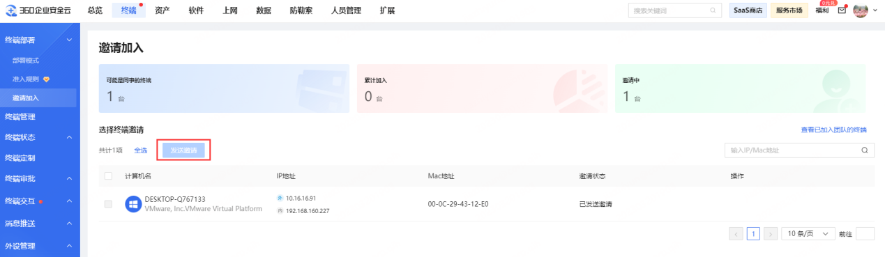 只需在 360 企业安全云控制台找到【邀请加入】功能入口,点击发送邀请,对方接收后就能成功加入团队 。