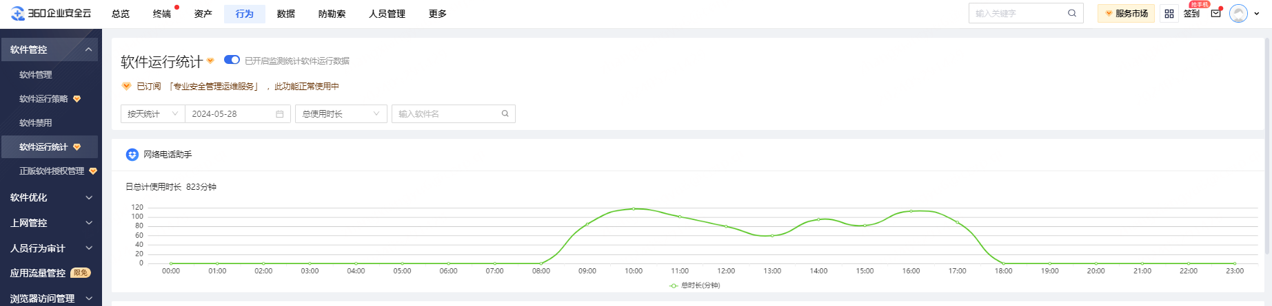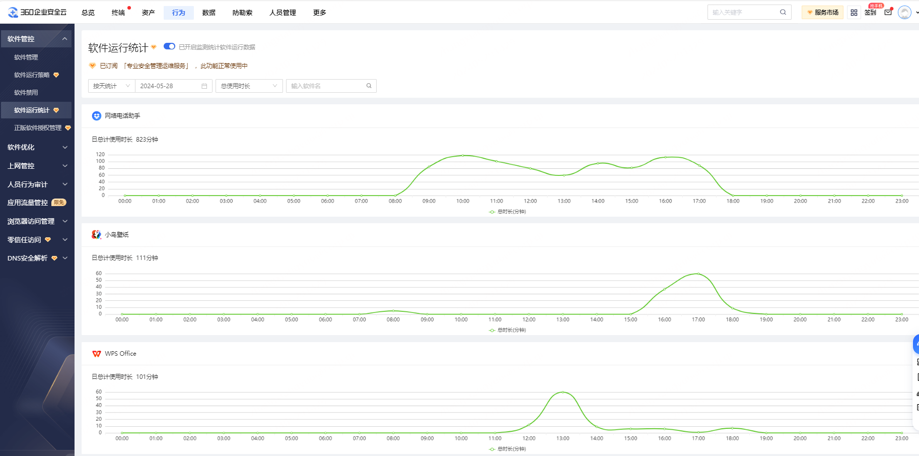 软件使用统计,可以按天、按周对终端上使用的软件进行使用总时长、软件使用平均时长统计,可帮管理员分析软件使用的高峰时间段。